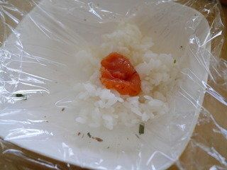 お皿の上に敷いたラップの上に、ごはんと好みの具をのせて…