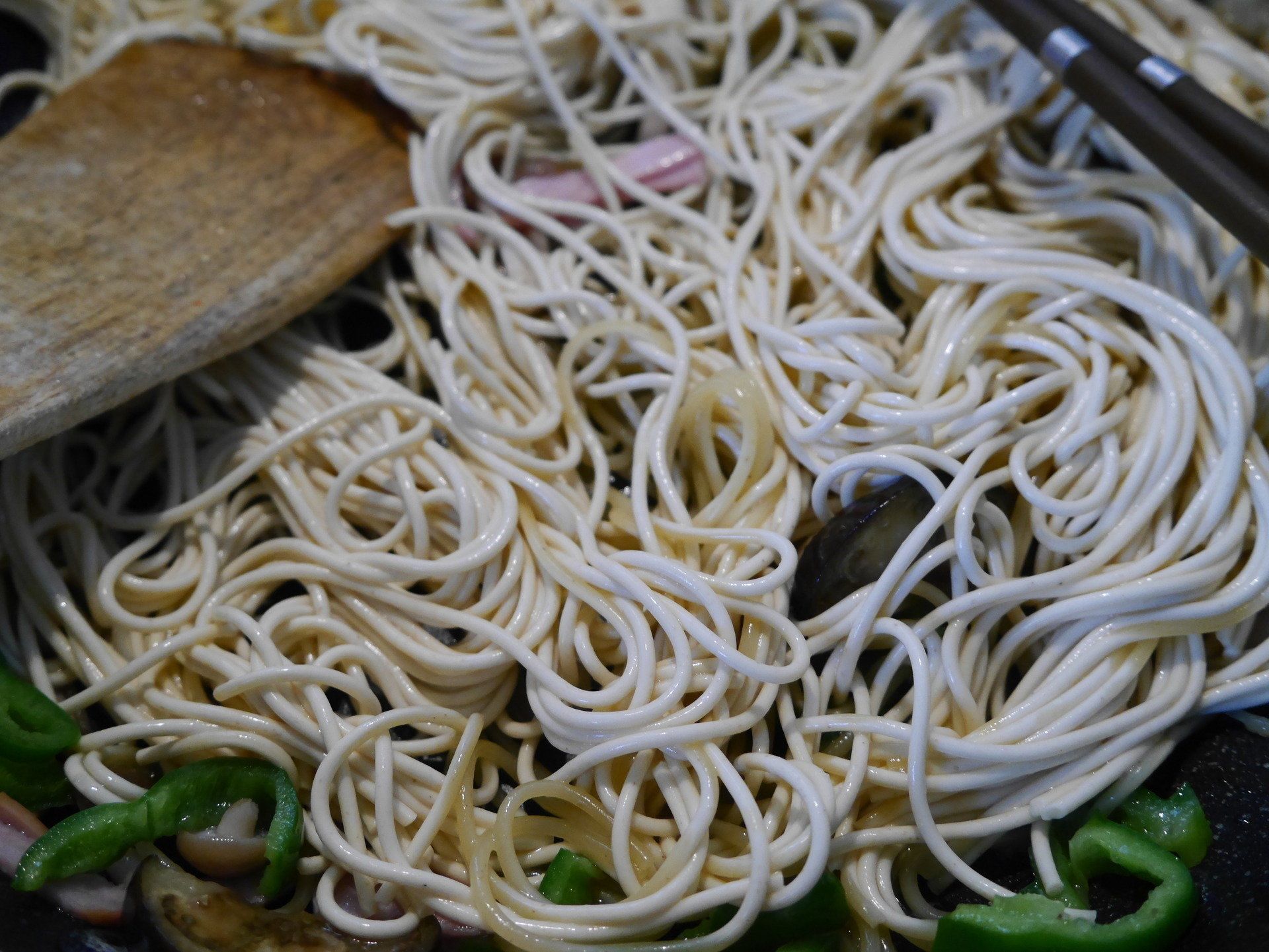 これを、油をしいたフライパンで炒めます、最初は真っ白だったパスタが、炒めていくと…