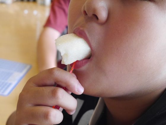 その名も「新王」。「梨の王様だ~!どんだけおいしいんだろ?」「早く食べようよ~!」大騒ぎの子どもたちに根負けして、食べてみることに。