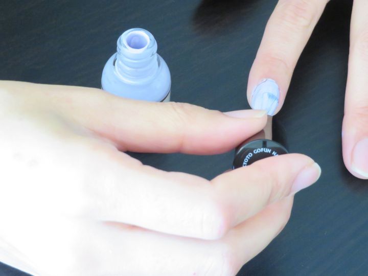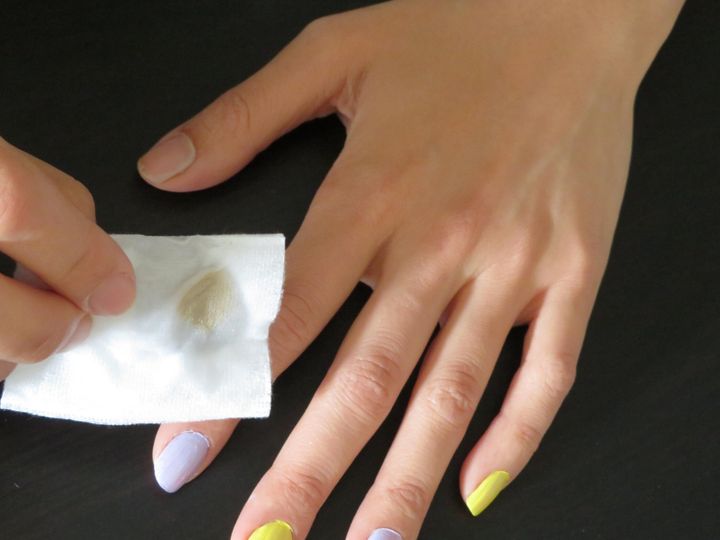 アルコールを含ませた脱脂綿を爪にあてて数秒待ち、軽く滑らせるときれいに色が落ちました。