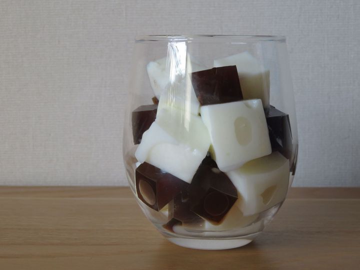 牛乳寒天とコーヒー寒天を組み合わせてつくったものです。