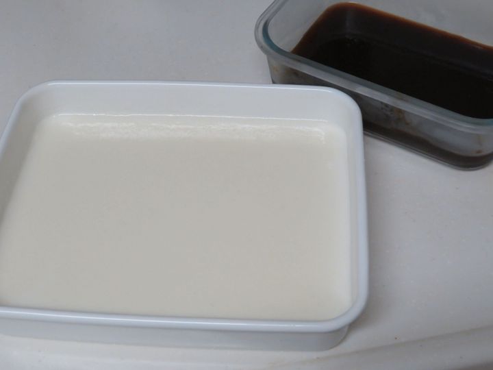 それが固まったら、豆乳・砂糖・寒天を煮溶かしたものを上に注いで再び冷やします。
