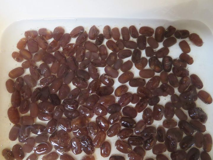 まずは容器の底に甘納豆をしきつめ、少し甘みをつけた透明の寒天液をひたるくらいに注ぎます。