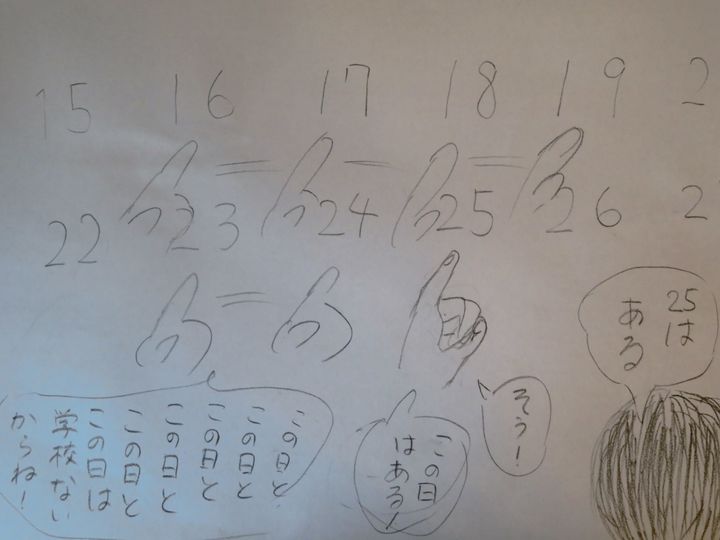 私はあわててカレンダーの平日の日付を指さしながら(土日祝日に学校がないことはわかっています)、「この日とこの日と…この日は学校ないよ!この日はある!」などと説明しました。