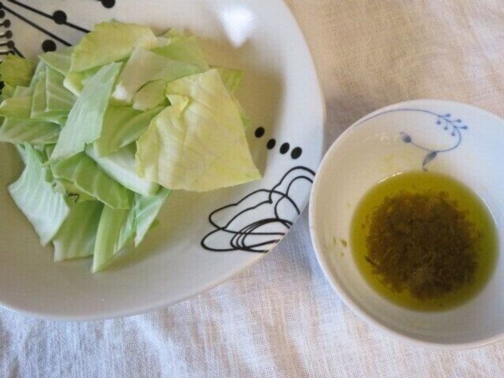ざく切りしたキャベツを皿に盛り、ゆずごしょう入りオイルを添えただけの一品。