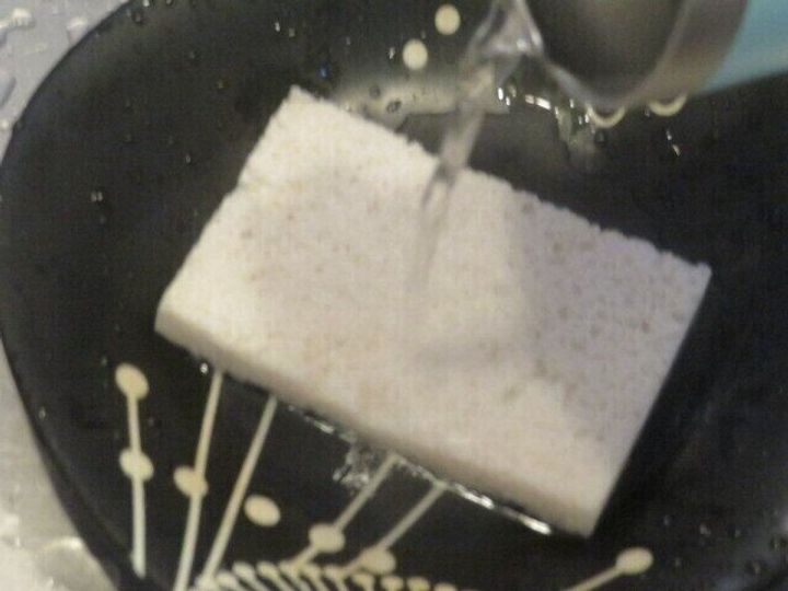私は皿の上にスポンジを置いてからコップについだお湯をかけています。