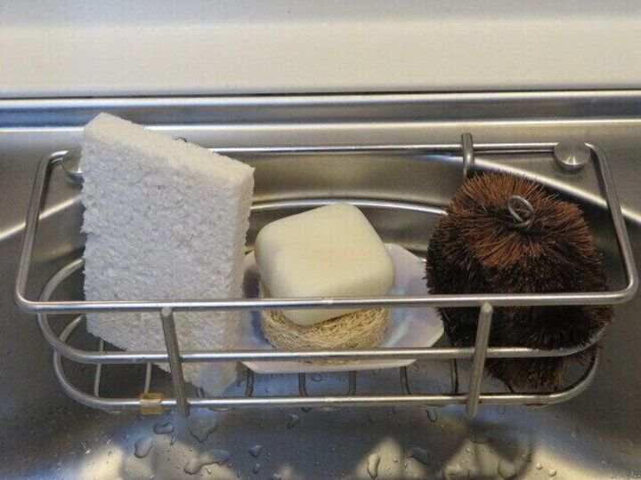 吸盤を使ってシンク側面につけることもできるはずですが、私は吸盤の裏側の汚れが気になるので備えつけのステンレスかごを使います。
