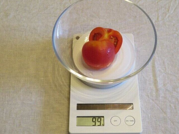やや小ぶりのトマトの可食部を量ったところ、99グラム。