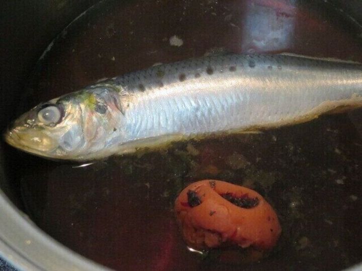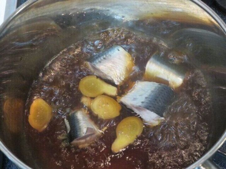 イワシの身がひたひたになるくらいの水に、砂糖とみりんとしょう油を1:1:1の割合で入れた煮汁で煮ます。