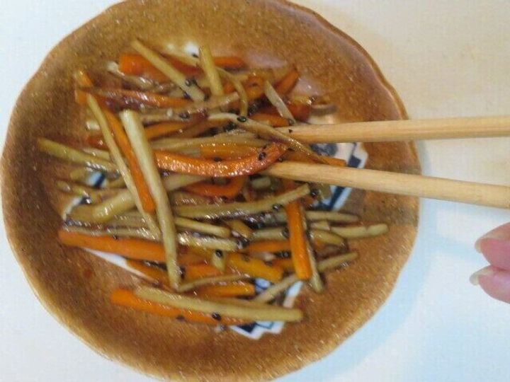 きんぴらをつくる時は、具材を炒めて味つけをし、水分をとばしてから最後にごまを入れて混ぜていました。