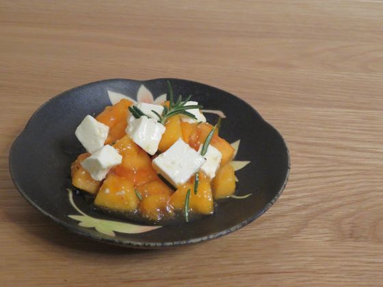 まずは、本当に簡単なメニューから。薄く切ったリンゴに、これまた薄く切ったカマンベールをのせただけのもの。
