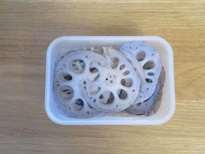 レンコンのきんぴらを作った時は、大きいレンコンを薄切りにしてゆでてから一部を取り分けて保存。