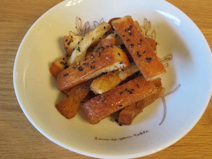 まだ食パンが余っていたので、細く切って油で揚げました。