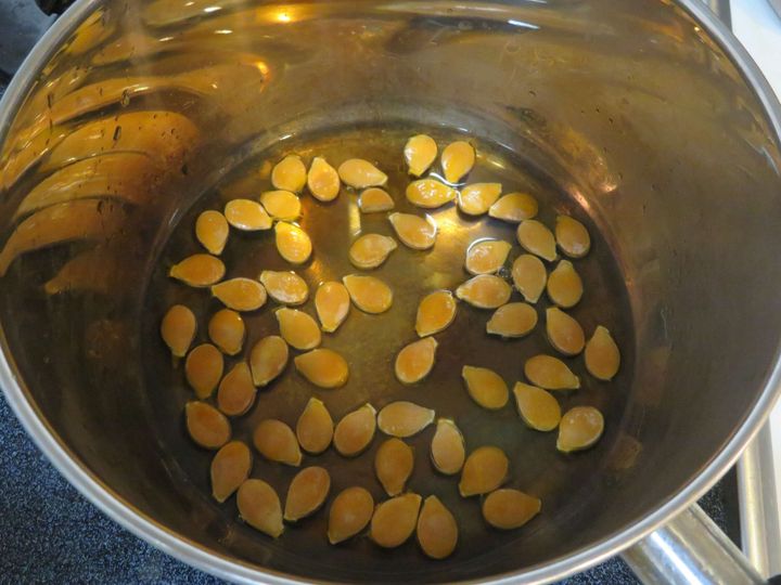 カボチャの煮物の煮汁を最初に少し取り分けて、別の鍋で種を煮てしまうと楽です。