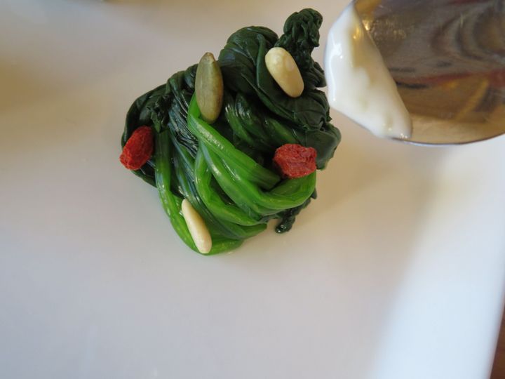クコの実や松の実をすき間に差し込むようにして飾り、レモン汁でのばしたマヨネーズをつけるとそれらしく見えてきます。