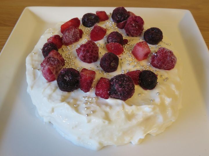 そこに水切りヨーグルトと冷凍フルーツをのせ、アラザンで飾れば可愛いケーキのできあがりです。