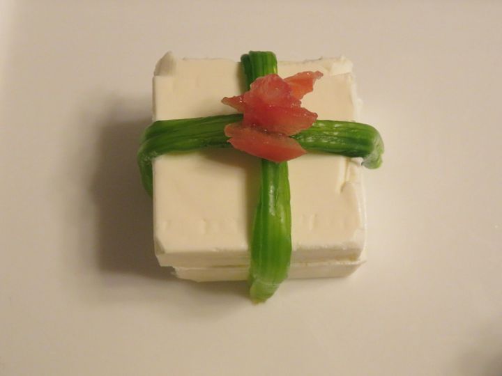 プレゼントは、クリームチーズを2つ重ねた上にホウレンソウの茎を十字に置いています。