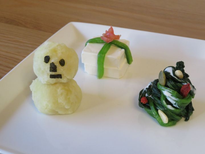 私がよくつくるのは、クリスマスツリーと雪だるまとプレゼントの形の前菜。