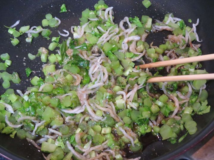 ちりめんじゃことごまの風味が良い仕事をするので、調味料は写真の量の場合みりんもしょう油も大さじ1くらいで充分。