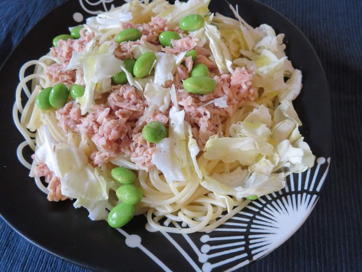 先日食べたのは、「ツナ缶+枝豆+ちぎったキャベツ+塩コショウ」で、火も包丁も使わない具材です。