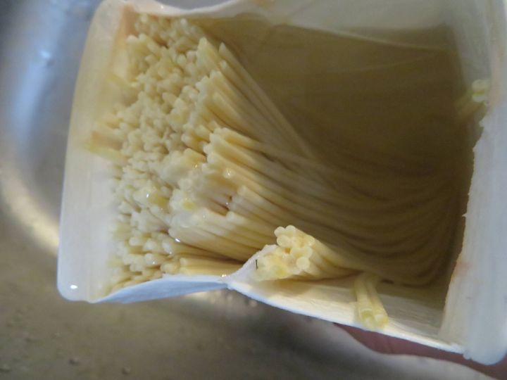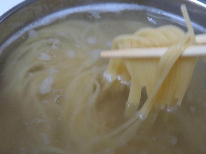 ゆで時間は約1分、ふやけて白っぽくなっていた麺が透き通っているのを確認したらゆであがりです。