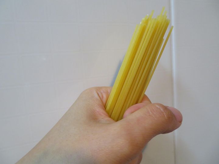 ただし、たくさんのスパゲティを一気に折るのは難しいので、鉛筆の太さくらい手に取って少しずつ折るようにしましょう。