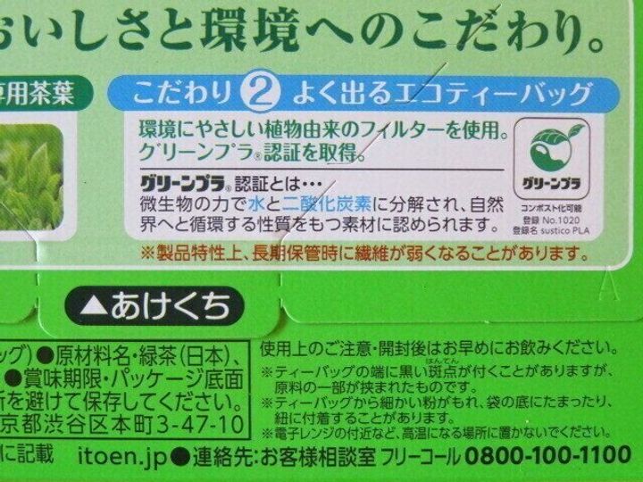 その伊藤園から出ている「お~いお茶 エコティーバッグ 緑茶 22袋」は、プラスチック製の不織布を使っていないのが特徴です。