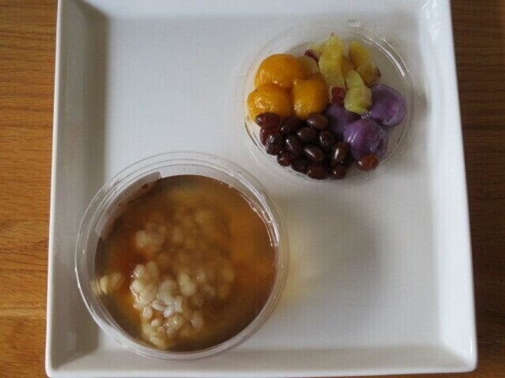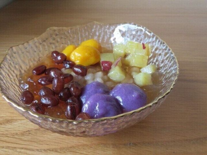 中皿に盛りつけた具材(紫芋団子、黄芋団子、かのこ豆、サツマイモ)を黒糖シロップジュレに入れて食べるスイーツです。芋圓(ユーエン)はもちもちとした食感の芋団子です