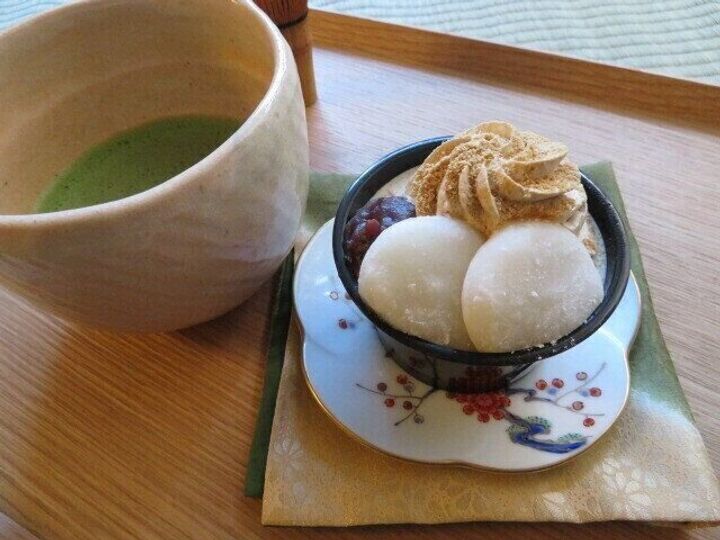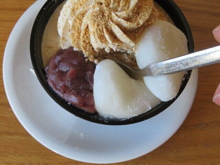 上にはやわらかそうな餅とふわふわのホイップ、あんこがのっています。