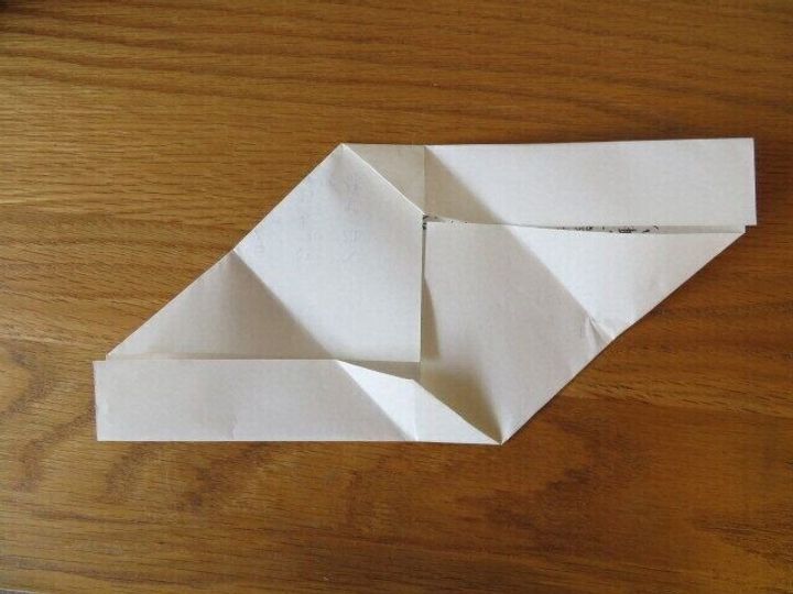 縦半分に折り目を入れ対角線上に端を三角に折り、余ったところを半分に折って、直角の角を中心線にそって折り、端をみみの部分に差し込む……文章では説明が難しいですね。