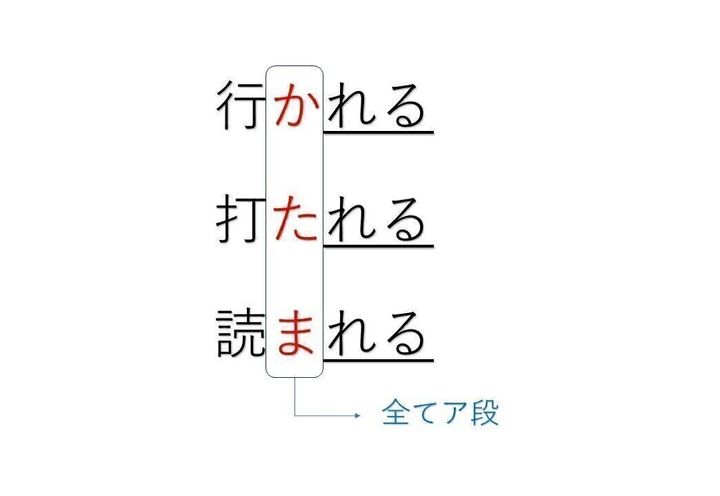 五段とサ変に「れる」がついている(ら抜きではない)パターンでは、「れる」の1文字前がア段の音になっています。