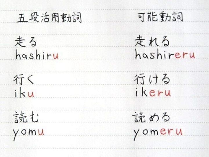 そこで五段活用の終止形から「u」の音をとりかわりに「eru」の音を加えることで可能の意味をあらわすことにしました。