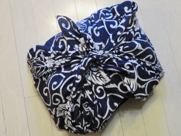 プラスチックの箱に入れるのも味気ない気がしてふろしきで包んだところ、すごく省スペースになり持ち運びも楽に。