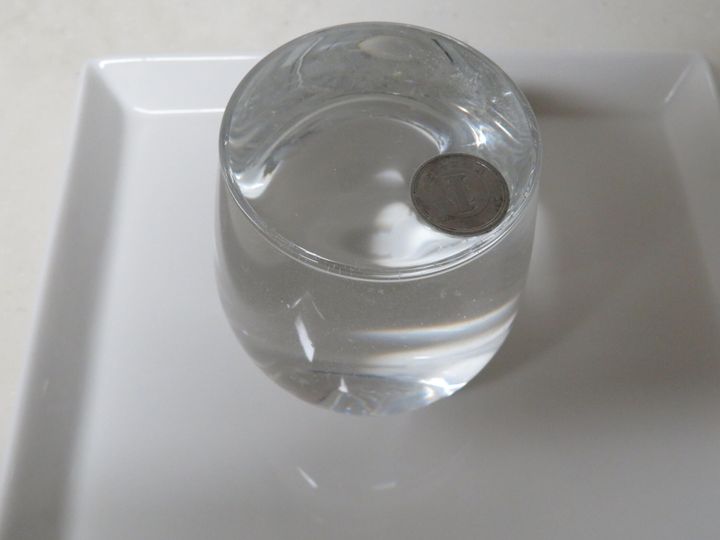 その水面に、一円玉を水平にしてすべらせるように置きます。