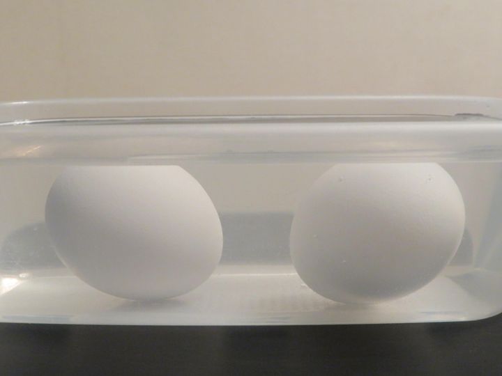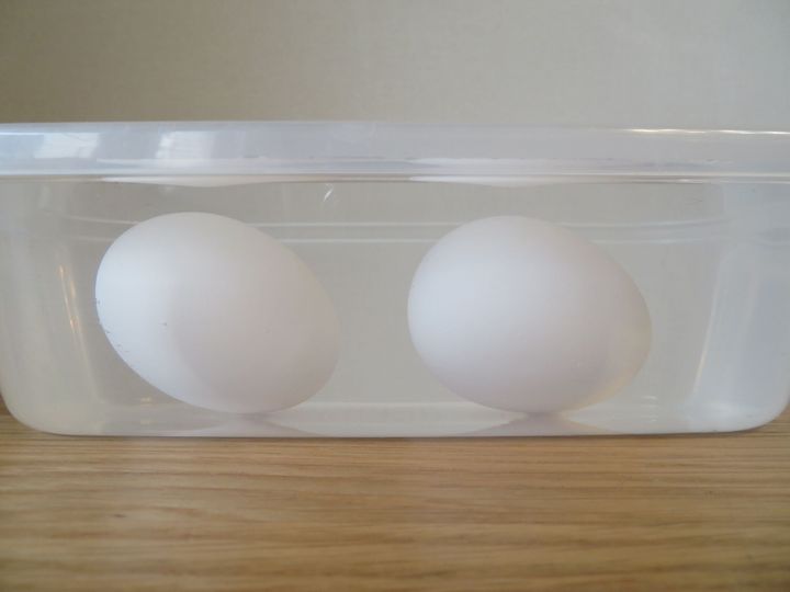 水を入れた容器に、2つの卵を同時に沈めてみました。