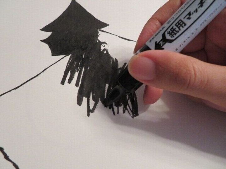 まずは紙にススキを置き、それにまたがるように魔女のシルエットを描きます。