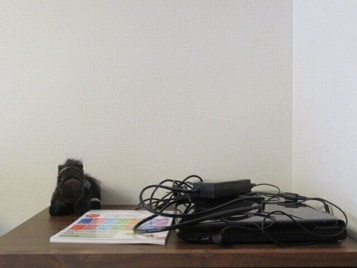 台の下にパソコンを置き、台の上によく使う息子のドリルと思い出のぬいぐるみを設置。