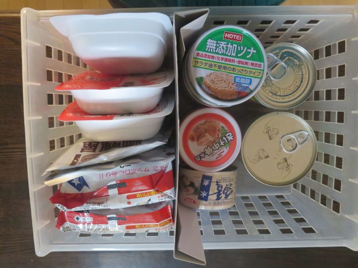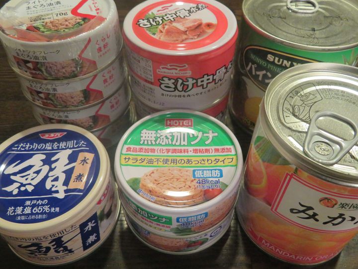 我が家の備蓄は缶詰が多く、子どもが食べる果物や魚中心に買っています。