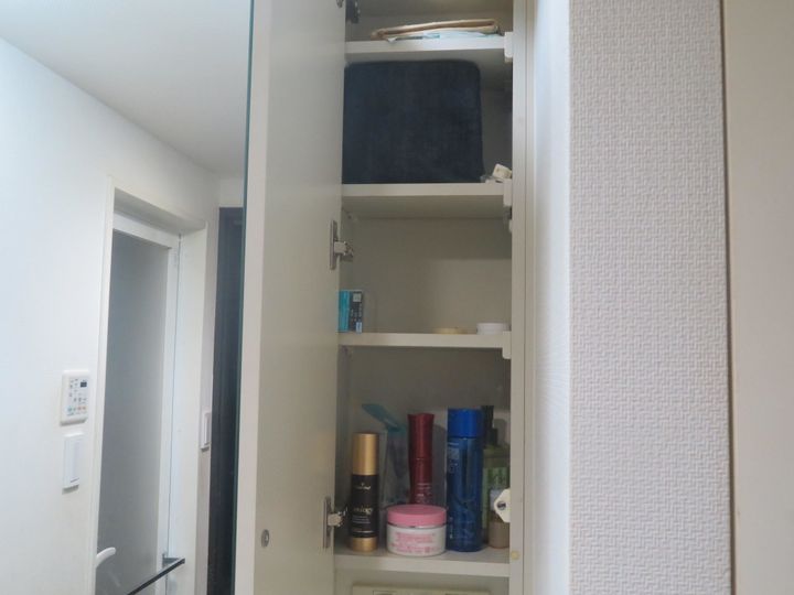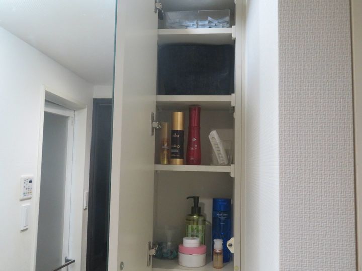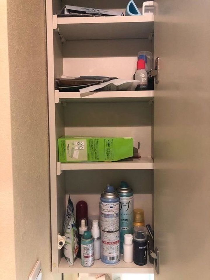 たろこさんの話では、一番下の段にヘアケア用品、その上の段に基礎化粧品がよいとのことでしたが、棚の高さが微妙に合わず。