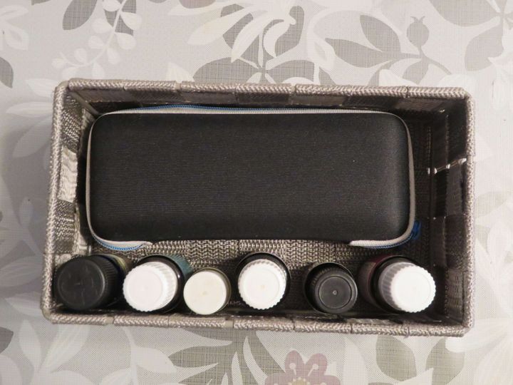 メガネケースが1つ、隙間にはアロマオイルのコレクション。