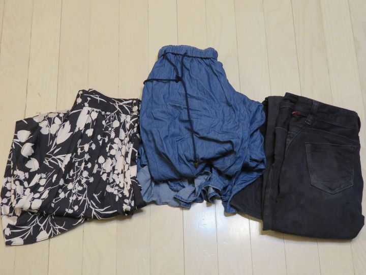 写真のスカートとパンツは、左から順に2,990円、1,333円、300円。