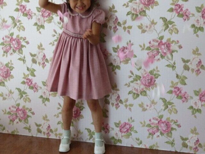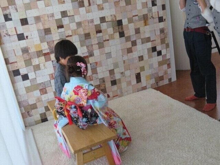 娘の着ているピンクのワンピースと白い靴、息子のグレーのジャケットはスタジオのものを拝借。