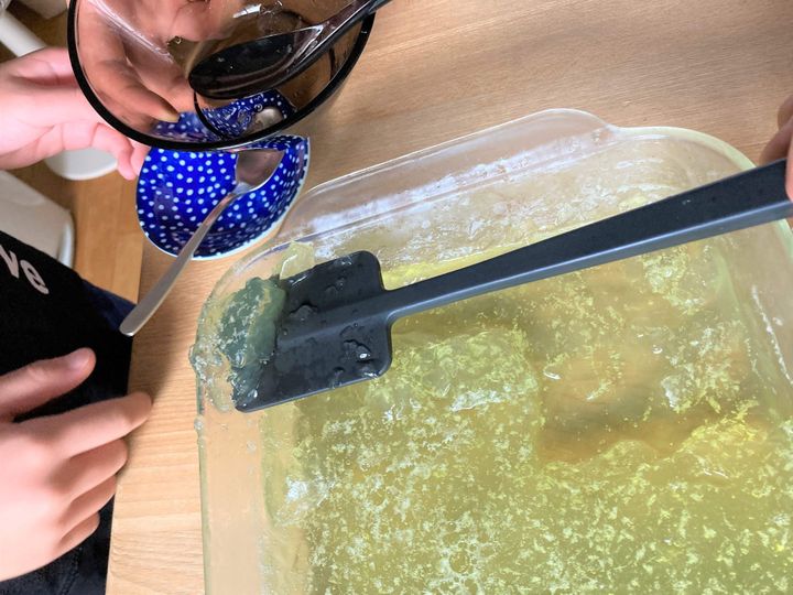 毎年、学校からの給食便りにサイダーかんのレシピがのっており、以前にも一度作ったことがあります。そのときはシュワシュワ感をあまり感じることができず、こんなものなのかな?と思ったのですが、それは寒天液の温度が52℃くらいの固まり始めるタイミングでサイダーを入れるということを見落としていたからだと気づきました。