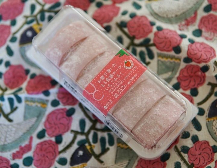大福みたいな生地で巻いてあるのかなと思っていましたが更に手が込んでいました。外側にあるいちご風味の求肥生地と、内側にある和菓子の生地のようなもち食感生地、ダブルのもちもち感が楽しめます。中のクリームはふわふわで、和と洋どちらも楽しめる融合スイーツです。ボリューム満点で6つにカットされているので、シェアして食べたい商品ですね。