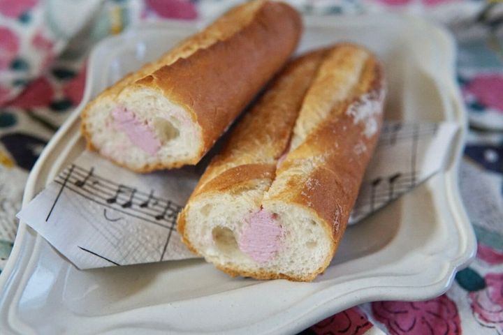 香ばしいフランスパンといちごフレーバーの香りがほわーん。小ぶりで長めのフランスパンは、柔らかめながらもしっかり食べ応えがあります。中に挟まれたいちごバタークリームは、柔らかすぎるとパンとあわないのかやや固めです。強い主張のある味ではありませんが、若干の酸味が含まれた甘みの中にバターの味わいもしっかり感じられました。