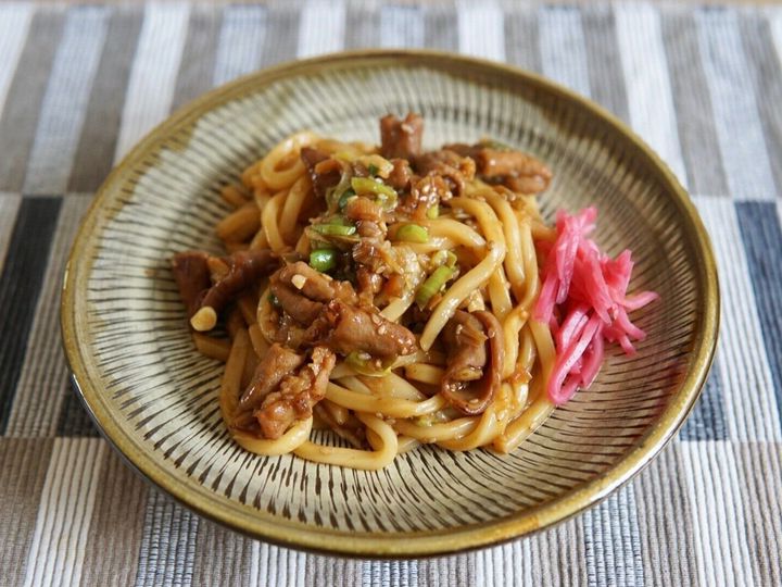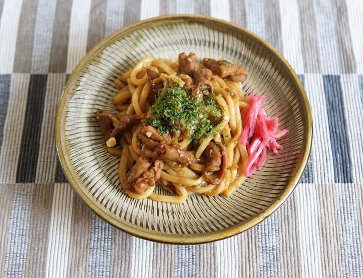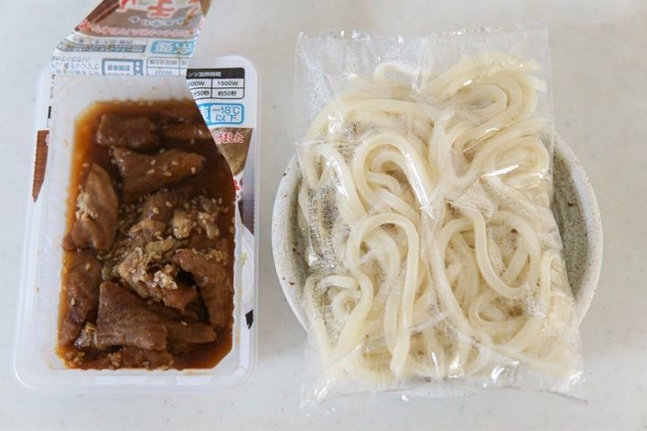 それぞれをレンジで温めてから絡め炒めるだけでもできる、簡単焼きうどん
