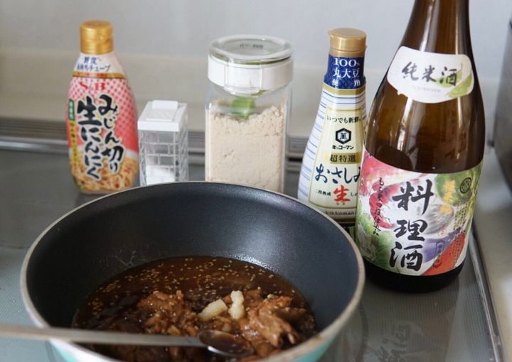 作り方は簡単。ホルモン焼きと讃岐うどん、どちらもパッケージに書かれた長さでレンジで温めてからフライパンで絡め炒めます。そのままでも美味しそうですが、リュウジさんは「砂糖(小さじ1.5)」「醤油(小さじ2)」「料理酒(小さじ2)」「うま味調味料(3振り)」「にんにくチューブ(3cm)」を足してホルモン焼きのタレを軽く煮詰めてから、温めた讃岐うどんと絡めていました。最後にゴマと、彩りも兼ねた刻みネギと紅ショウガを添えて完成です。