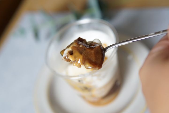 キャラメルミルクプリンは、舌にのせるととろけるくらいの柔らか食感。まろやかで甘く、上にのっているホイップとあわさることで、ミルク感が強く感じられます。そして、その下にある珈琲ゼリーは一口大にカットされていて、わらび餅とゼリーの中間といった具合のちゅるんとした弾力。珈琲の風味やほろ苦さが感じられます。底のほうには、キャラメルらしいさらなる濃厚な甘味とコクが感じられる塩キャラメルソースが入っており、横から見ると色味もグラデーションがかっていて美しいです。少し甘すぎるのではないかと思うくらいの深い甘みを感じながらも、珈琲のほろ苦さにも引っ張られて、どんどんと食べ進めてしまう、そんな魅力を持っていました。
