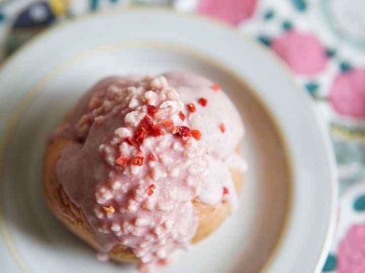 ほんのりピンク色が混ざった印象の生地に、いちごコーティングしたクランチとドライストロベリーがトッピングされています。