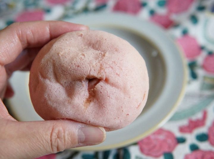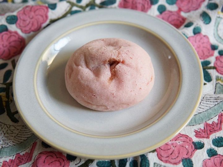 今回のもちぷよとのコラボは、いちごはアーニャの髪色、チョコは髪飾りを意識していると思われます。もちぷよ独特のもっちりとした生地はピンク色。つつまれているのは、甘酸っぱくて少し固めのいちごクリームと、噛むと中からトロリと溶け出る甘いチョコソースです。スイーツにおける、苺とチョコの組み合わせはどれも間違いがないと思っていますが、こちらの商品も、いちごの甘酸っぱさとチョコの純粋な甘さの組み合わせがたまりません。甘すぎることがないため、お饅頭くらいの大きさがありますが、ペロリと食べてしまいました。